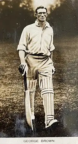 George Brown was born in Cowley, Oxfordshire, the son of Edwin Brown and Sarah Ann (née Casey). As his figures indicate, he was a very versatile cricketer, being useful as a batsman of stout hearted disposition, a bowler of considerable ability and a wicketkeeper, as well as a fine fieldsman in every position. He played first-class cricket for Hampshire between 1908 and 1933. Though he was never their regular keeper, it was in that role that he played for England, with stiffening the batting in mind.[1] Gilbert Jessop said that he proved himself to be a brilliant wicket-keeper in the Tests he played in 1921.[2]