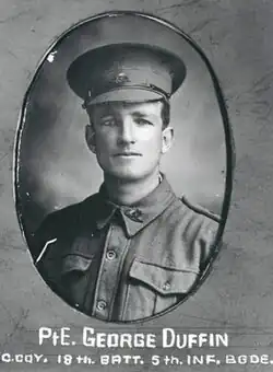 At the beginning of World War I, Duffin enlisted with the AIF and sailed to Egypt, where he remained for brief period before arriving on the Gallipoli Peninsula on 20 August 1915. He was one of around 1,000 men from the 18th Battalion tasked with capturing Hill 60 from the Turks on his third day at Gallipoli. While charging towards the enemy trenches, Duffin is believed to have been struck by a shell. His body was never recovered.[4]