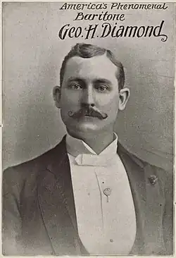 George H. Diamond was born in Buffalo, New York in 1862 to John and Catherine Diamond. He began performing in variety shows in early 1888.[1] In 1889 he was advertised as a famous contortionist.[2] Beginning around 1890 Diamond toured the nation as a singer of popular tin pan alley songs on the vaudeville circuit. In 1892 he began recording for the New Jersey Phonograph Company.[3] In 1893 he recorded for the Columbia Phonograph Company[4] and North American Phonograph Company.[5] His repertoire was divided into sentimental songs like "My Sweetheart's the Man in the Moon" and comic songs like "I Wish They'd Do it Now". His prominence in these catalogs suggests he was already famous as a performer. At this point in the recording industry, however, duplication was relatively crude so successful recording artists were required to frequently return to the studios to resupply stock. Diamond returned to touring and seems to have stopped recording in late 1893.