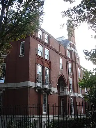 The Howards lived in London in Kensington, in a house at 1 Palace Green,[7] built for them by Arts and Crafts architect Philip Webb in 1870,[8] and at Naworth Castle. Among their visitors at Naworth were Robert Browning, William Ewart Gladstone, Lewis Carroll, Alfred, Lord Tennyson and many others.[9] William Morris was an intimate friend, and his wallpapers were used in Kensington, at Naworth Castle and at Castle Howard when George inherited it.[10] With Morris and Webb, he was one of the founding members of the Society for the Protection of Ancient Buildings.[11]