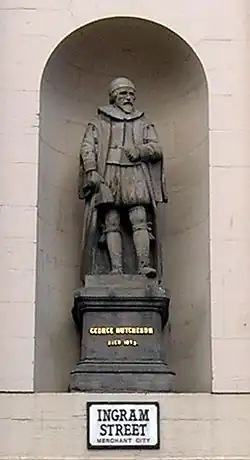 By deed bearing date 16 December 1639 he mortified and disposed a tenement of land on the west side of the old West Port of Glasgow with yard and tenements there, for the building of one perfyte hospital for entertainment of the poor, aged, decrepit men to be placed therein, for whose maintenance after the hospital should be built he also mortified certain bonds amounting to the principal sum of twenty thousand merks. The inmates were to be aged and decrepit men above fifty years of age who had been of honest life and conversation. Other mortifications to the hospital were made by his brother Thomas. George also granted legacies to his brother Thomas and to three nephews, but descendants of two of these nephews died poor men in the hospital. The hospital lives on today as Hutchesons’ Grammar School.