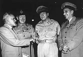 In March 1943 Jones proposed that he take over responsibility for air operations in defence of the Australian mainland but General Douglas MacArthur, Supreme Commander SWPA, refused to countenance it.[34] The next month, with the support of the Australian Air Board, Jones tried to remove Bostock from RAAF Command and replace him with Air Commodore Joe Hewitt, AOC No. 9 Operational Group (No. 9 OG). Bostock appealed to Kenney, who advised Jones that he was opposed to any such change of command and threatened to escalate the matter to the Australian government. MacArthur subsequently told Curtin that Hewitt "was not an adequate replacement" for Bostock, and the matter was dropped.[35] Six months later Jones would sack Hewitt over morale issues in No. 9 OG raised during the offensive on Rabaul; Kenney called Hewitt's removal "bad news".[31]