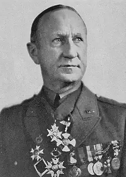 Moseley retired from the Army in October 1938 with a statement that described the New Deal as a growing dictatorship: "We do not have to vote for a dictatorship to have one in America ... We have merely to vote increased government responsibility for our individual lives, increased government authority over our daily habits, and the resultant Federal paternalism will inevitably become dictatorship." Secretary of War Harry Woodring called his statement "flagrantly disloyal."[13] In April 1939 he attacked Jews and said that he foresaw a war fought for their benefit. He attacked President Franklin D. Roosevelt for appointing Felix Frankfurter to the U.S. Supreme Court. He predicted that the U.S. Army would not follow the orders of FDR's leftist administration if they "violate all American tradition." He described fascism and Nazism as good "antitoxins" for the United States that would "disappear when the disease of Communism is cured," adding that "the finest type of Americanism can breed under their protection as they neutralize the efforts of the Communists."[14] Moseley understood that as a retired general, he remained subject to the War Department's jurisdiction, writing to a friend: "The only good I can do now is in keeping up quite a large correspondence with men who are in a position to influence public affairs. The enemy has completely silenced me, and I am handicapped, as I am still a Government official."[15] Moseley also tried to lobby the New York National Guard adjutant general to "cleanse" the state forces of all Jews and persons of color.[15]