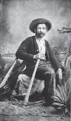 The presence of copper ore in the Mule Mountains of southeast Arizona may have been known as early as 1876, but the first mining claim was filed on August 2, 1877.[1] In 1877, a U.S. Cavalry patrol from Fort Bowie was tracking Apache Indians and camped at what was later called Iron Springs. The men didn't like the quality of the water and they sent Scout Jack Dunn to look for better quality water. During his search he found a spring along a very large cliff of limestone, later named Castle Rock, and on his return an outcrop containing lead carbonate, which was known to carry silver, in a gorge later known as Tombstone Canyon. Dunn told his commanding officer Lt. John Rucker and a packer named Ted Byrne of his discovery. They named the find the "Rucker" and planned to file a claim, but were delayed when their patrol was ordered to resume pursuit of a band of Apache warriors. Before departing Fort Bowie, they met a 42-year old George Warren and persuaded him to file a claim for them with the agreement that Warren would name Dunn in all notices of locations for mining claims that he located. They provided him with a grubstake, provisions, and a map to mining claim site.[4]