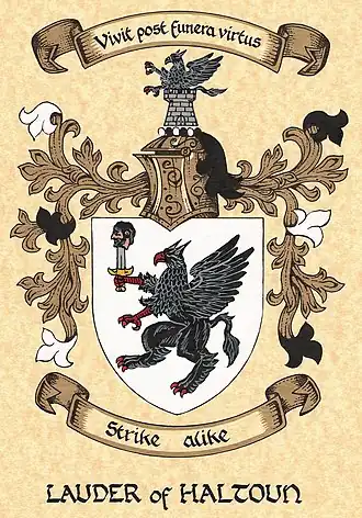 Nisbet states that the arms of "Lauder of Hatton" [sic] were "argent, a griffin rampant sable, beaked and membred gules, holding a sword with its forefoot, supporting a Saracen's head, proper; crest: a tower with a demi-griffin issuing out of the top of it: motto, Strike Alike". He alleges that the reason for the sword and the saracen's head is because they were descended from the 1189 crusader, Sir Robert de Lawedre.