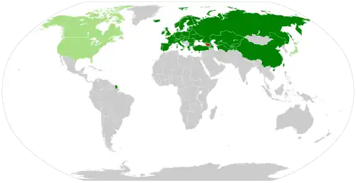 Several languages continue to use the Russian variant of the country's name, Gruzia, which the Georgian authorities have sought to replace through diplomatic campaigns. Since 2006, Israel,[38] Japan,[39] South Korea[40] and Hungary[41][42] officially changed their appellation of the country to variants of the English Georgia.[43] In 2020, Lithuania became the first country in the world to adopt Sakartvelas in all official communications.[44]