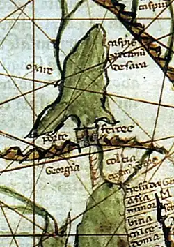 The first mention of the name Georgia is in Italian on the mappa mundi of Pietro Vesconte dated 1320.[25] At the early stage of its appearance in the Latin world, the name was often spelled Jorgia.[26] Lore-based theories were given by traveller Jacques de Vitry, who explained the name's origin by the popularity of St. George among Georgians,[27] while Jean Chardin thought that Georgia came from the Greek γεωργός ('tiller of the land').