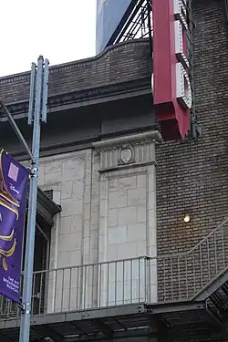 The ground floor of the auditorium contains a water table made of granite.[21] The rest of the facade is largely made of architectural terracotta, which surrounds patches of buff brick in Flemish bond.[12][21] Along the ground floor on 45th Street, there are three glass-and-bronze double doors with aluminum frames and transoms, which lead to the lobby. There are display boxes on either side of the lobby doors, and a bronze stage door is to the right (west) of these doors. A marquee extends above the doors.[22] The northeastern corner of the facade is curved and contains an entrance to the ticket lobby. This entrance contains a double door, above which is a glass transom panel. The corner entrance is topped by a broken pediment, which is supported by console brackets on either side and contains an escutcheon at the center.[23][24]