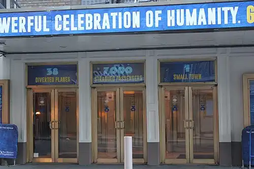 In the early 2010s, the Schoenfeld hosted a mixture of musicals and plays, which generally ran only a few months. The short runs were required because of the shortage of available Broadway theaters.[27] They included A Behanding in Spokane and A Life in the Theatre in 2010; The Motherfucker with the Hat and Bonnie & Clyde in 2011; The Best Man and Glengarry Glen Ross in 2012; and Orphans in 2013.[20][26] Subsequently, the Schoenfeld was renovated in 2014.[27] The Schoenfeld continued to host short runs of plays and musicals into the mid-2010s, with The Bridges of Madison County and It's Only a Play in 2014; The Audience and China Doll in 2015; and American Psycho in 2016.[20][26] The play The Humans relocated from the Helen Hayes Theatre to the Schoenfeld in 2016,[321] a relatively rare move that was required because the Hayes was being renovated.[322] The Humans had to close at the beginning of 2017 to make way for the musical Come from Away,[323] which opened in March 2017.[324][325] Come From Away continued at the Schoenfeld for four years[324] until the theater closed on March 12, 2020, due to the COVID-19 pandemic.[326] The Schoenfeld reopened on September 21, 2021, with Come From Away,[327] which closed in October 2022 as the theater's longest-running show.[328] This was followed the same month by Take Me Out, which had transferred from the Hayes Theater.[329][330] Life of Pi opened at the theater in March 2023,[331][332] running for four months.[333] This was followed in 2024 by the musical The Notebook,[334] running for nine months.[335] Afterward, the musical Buena Vista Social Club opened there in March 2025.[336]