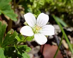 The flowers are a white to pale pink. The stalks that grow up to 7cm[9] contain a singular flower, consisting of five green sepals and five white to pale pink petals with translucent veins.[10] The petals are 5-6mm long and the tips may be notched or rounded. Each plant has both male and female organs and is usually pollinated by insects.[6] Geranium potentilloides flower from around October to April in its native habitat.[7][9]
