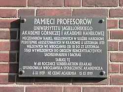 Arrests in the city of Kraków likewise began at the end of March 1940 with a wave of a thousand taken into custody. German police also met many of those on their lists as they left church services on May 3. Others were arrested individually.[17] Most were held at the Montelupich Prison, where a Standgerichten presided over by Ludwig Hahn heard cases on the ground floor. In May 290 arrestees were convicted of treason. While, as happened in Warsaw, some were taken to nearby forests near Przegorzały and Nowy Wiśnicz to be shot, at least 150 executions were carried out at Fort 49 in Wzgórza Krzesławickie in the city's northwest, continuing the site's use for that purpose since the preceding October.[46][47]