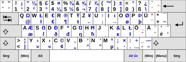 Degree symbolCircumflex accentMultiplication signExclamation mark1 (number)ApostropheQuotation mark2 (number)Square (algebra)Section sign3 (number)Cube (algebra)Dollar sign4 (number)Dash#Em dashPercent sign5 (number)Inverted question and exclamation marksAmpersand6 (number)Inverted question and exclamation marksSlash (punctuation)7 (number)Braces (punctuation)Parentheses8 (number)BracketParentheses9 (number)Bracket0 (number)Braces (punctuation)Question markßBackslashGrave accentAcute accentDot (diacritic)BackspaceTab keyQAt signWCaronEEuro signŒRDiaeresis (diacritic)TMacron (diacritic)ZDouble acute accentUBreveITildeDotless IORing (diacritic)ØPHook aboveÞÜHorn (diacritic)Long sAsteriskPlus and minus signs#Plus signTildeReturn keyCaps lockALess than or equal toÆSGreater than or equal toDDiameter#Diameter symbolÐFPrime (symbol)GDouble primeHCapital ẞJCedillaKComma#Diacritical usageLOgonekŁÖDot belowÄBar (diacritic)Apostrophe#ComputingNumber signRegistered trademark symbolƏReturn keyShift keyGreater-than signLess-than signVertical barYGuillemetXGuillemetQuotation markQuotation markCCopyright symbolVGuillemetQuotation markQuotation markBGuillemetQuotation markQuotation markNDash#En dashMMicro-SemicolonCommaʻOkinaEllipsisColon (punctuation)Full stopZero-width non-joinerInterpunctUnderscoreHyphenSoft hyphenShift keyControl keyFn keyWindows keyAlt keySpace (punctuation)Non-breaking spaceThin spaceAltGr keyISO/IEC 9995#Level and group selectionWindows keyMenu keyControl key
