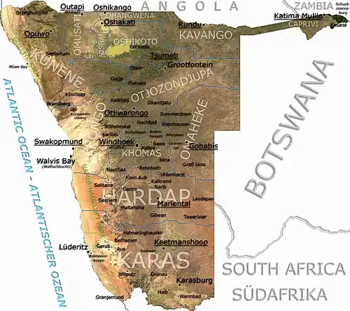 Unlike other parts of the world with large German immigration and large numbers of German place names, only few places had their name changed, for example Luhonono, the former Schuckmannsburg.[5] Especially in the south, in the regions of Hardap and ǁKaras, many place names are German or Afrikaans. Examples include Keetmanshoop (after German industrialist Johann Keetman and the Afrikaans word for "hope", and Lüderitz, named after the German merchant Adolf Lüderitz.[6]
