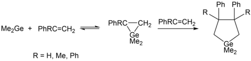 There is no reaction between simple alkenes and free germylenes.[5] However, styrenes and α-substituted styrenes are able to react with Me2Ge. The resulting product is a 1:1 mixture of the syn and anti-isomers of 3,4-diphenyl-3,4-R-1,1-dimethyl-1-germacyclopentane.[32]