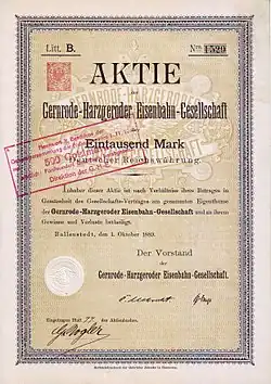 The Gernrode-Harzgerode Railway Company was founded on 10 May 1886 with the aim of developing the East Harz by means of a small scale railway line. After the experience of the Felda Railway in Thuringia it was decided on cost grounds that a concession would be granted in March 1887 for a 1,000 mm (3 ft 3+3⁄8 in) metre gauge line from Gernrode to Harzgerode and Silberhütte. Gernrode had already had a railway connexion since 1885.