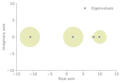 The eigenvalues are -10.870, 1.906, 10.046, 7.918. Note that this is a (column) diagonally dominant matrix: . This means that most of the matrix is in the diagonal, which explains why the eigenvalues are so close to the centers of the circles, and the estimates are very good. For a random matrix, we would expect the eigenvalues to be substantially further from the centers of the circles.
