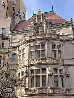 The mansion has a limestone facade.[13][14] Among the decorative details are ornamental carvings and round-arched windows in the French Renaissance style,[13] which are concentrated on the upper stories.[17] The roof is red and contains a copper cresting, as well as various dormers and finials.[13][14][18]
