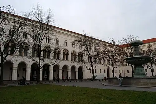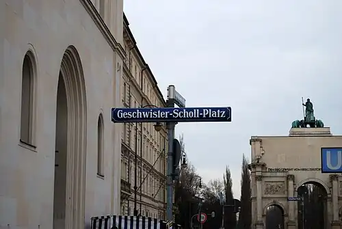 48°09′02.68″N 11°34′50.25″E / 48.1507444°N 11.5806250°E Geschwister-Scholl-Platz (Scholl Siblings Plaza) is a short semi-circular plaza located in front of the main building of the Ludwig Maximilian University of Munich (Ludwig-Maximilians-Universität München), located on the Ludwigstraße in Munich, Germany.[1] The plaza is named in memory of the Scholl siblings, Sophie Scholl and Hans Scholl, students at Ludwig Maximilian University of Munich during World War II who were among the founding members of the White Rose (Weiße Rose) resistance movement.[2]