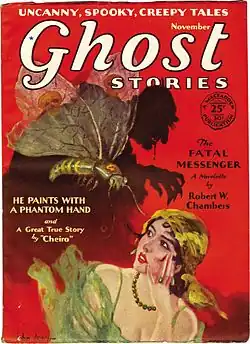 Fantasy and occult fiction had often appeared in popular magazines prior to the twentieth century, but the first magazine to specialize in the genre, Weird Tales, did not appear until 1923.[1] Ghost Stories, which was launched by Bernarr Macfadden in July 1926, is one of Weird Tales' earliest competitors.[1] Macfadden also published true confession magazines such as True Story; Ghost Stories followed this format, with the contents mostly produced by the publisher's staff writers, and attributed in print to a first-person narrator. The magazine was initially printed on slick paper, which was sufficiently good quality to allow photographs to be used, and many of the stories had accompanying photographs purporting to be of their protagonists. These were replaced by line drawings when the magazine was switched to pulp paper in July 1928. Ghost Stories occasionally printed contributions from outside writers, including "The Apparition in the Prize Ring", by Robert E. Howard, under the pseudonym "John Taverel". Popular writers such as Frank Belknap Long, Hugh B. Cave, Victor Rousseau, Stuart Palmer, and Robert W. Sneddon all sold stories to Ghost Stories, though the quality suffered because of the limited scope the magazine's formula gave them. Carl Jacobi's first published story, "The Haunted Ring", appeared in the final issue.[2][3][note 1]
