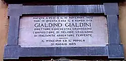 Plaque at the house where Gialdini lived in Pescia. It is unclear why it gives 1842 as his birthyear; all other sources, including many published before 1925, give 1843. - Eco della Lombardia (collection of 50 popular songs, edited by Giardini and Giulio Ricordi)