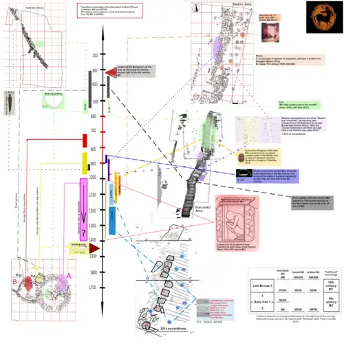 A paved road, delimited by vertical slab stones, runs parallel to the latter mortuary area. The construction of the road is supposed to be contemporary to the monumentalization of the necropolis.[35] The Bedini excavations have unearthed an area containing thirty two slab-cist tombs, made of a stone different from the one used in the serpentine-shaped area.[35] The cist tombs were mostly without their cover slabs, as these were wrecked during centuries of agricultural activities in the area. This so-called "Bedini's area" appears to have undergone three phases of development: