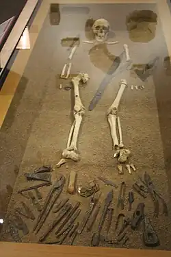 Other evidence of this culture, "remnants", were collected in other Giberville burials, including a buckle and a buckle plate.[6][49] These objects were buried in the graves of armed men with spears, bows, and axes, along with their wives.[6]