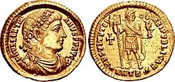 At the emperor's feet[59] is a "prisoner" with unbound hands. The pattern is an artistic creation, although it is based on accurate representations circulating in Gallic workshops[49] at the end of the 4th century.[60] In imperial depictions, the right hand held a prisoner or a shield. This scene is similar to representations on the reverse of circulating coins of the Gloria Romanorum type.[49] In another depiction, the emperor holds a standard in one hand, with a bound captive at his feet and the other on a shield.