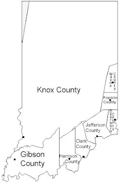 Starting in 1794, Native American titles to Indiana lands were extinguished by usurpation, purchase, or war and treaty. The United States acquired land from the Native Americans in the 1804 Treaty of Vincennes, which included the future Gibson County. Settlers had been pouring into the extreme southwest part of the Indiana Territory starting in 1789, and by 1813 there was sufficient to form a local governing body. The area included in present-day Gibson County had been first placed under the jurisdiction of Knox County, formed in 1790. Parts of that extremely large county were partitioned off in 1801 to create Clark, in 1808 to create Harrison, in 1810 to create Jefferson and Wayne, and in 1811 to create Franklin counties. On April 1, 1813, the Territorial legislature authorized partitioning a further large section of Knox to create Gibson County. The boundaries of this new county were reduced that same month (April 30, 1813) to create Warrick; in 1814 to create Perry and Posey; in 1816 to create Pike; and finally in 1818 to create Vanderburgh counties.