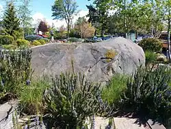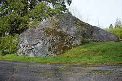 Saved from destruction by sit-in conducted by Cascadia College environmental politics students, and relocated away from construction site.[16][17][18][19][20] The rock, which several students occupied during the sit-in, was about 2 meters across before being jackhammered to two thirds its original size.[19] |