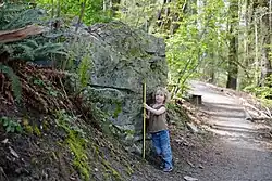 | Ravenna Park erratic in Ravenna Park in Seattle, a granodiorite stone three yards (2.75 meters) tall in Ravenna Creek with a wooden footbridge that wraps around it.[36][37] | c. 10 feet (3.0 m) | |