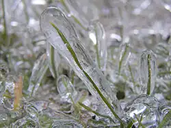 Glaze[1] or glaze ice, also called glazed frost or verglas,[2][3] is a smooth, transparent and homogeneous ice coating occurring when freezing rain or drizzle hits a surface.[4] It is similar in appearance to clear ice, which forms from supercooled water droplets. It is a relatively common occurrence in temperate climates in the winter when precipitation forms in warm air aloft and falls into below-freezing temperature at the surface.