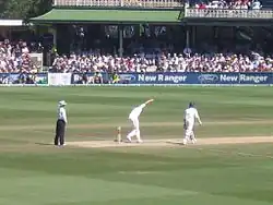 McGrath's bowling was not of express pace. Rather, he relied on unerring accuracy and subtle seam movement, which he derived from his high wrist action and lengthy follow-through.[26][27] His height (195 cm), combined with a high arm action, allowed him to extract extra bounce, which often surprised batsmen. In the later years of his career he developed as a swing bowler.[28]