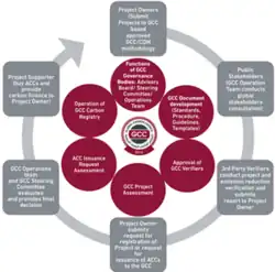 GCC Program has developed the governance structure, systems, carbon registry and the documentation framework to facilitate the building of low-carbon economies. This is via operation of a voluntary carbon marketplace to provide recognition of, and facilitate carbon finance for, GCC projects. The GCC Operations Team in Doha, Qatar serves as Secretariat of the GCC Program and works under the strategic advice of the GCC Advisory Board. Decisions on projects or issuance of Approved Carbon Credits (ACCs) are made collectively by the GCC Steering Committee, composed of nominated and recognized experts, based on a positive verification report by a GCC Verifier.[8]