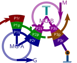 Per the patent, the planetary gearsets P1 and P2 are compounded, with MG-A driving (or being driven by) the sun gear of P1, which is coupled to the ring gear of P2, and the carriers for the planet gears in P1 and P2 are coupled.[23]: col.6 ll.24–33 Similarly, MG-B drives (or is driven by) the sun gear of P2, which is coupled to the sun gear of P3 via a hollow shaft.[23]: col.6 ll.54–64