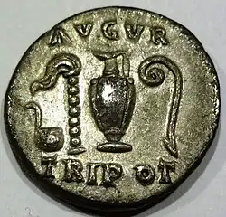 Augurium (plural auguria) is an abstract noun that pertains to the augur. It seems to mean variously: the "sacral investiture" of the augur;[27] the ritual acts and actions of the augurs;[28] augural law (ius augurale);[29] and recorded signs whose meaning had already been established.[30] The word is rooted in the IE stem *aug-, "to increase," and possibly an archaic Latin neuter noun *augus, meaning "that which is full of mystic force." As the sign that manifests the divine will,[31] the augurium for a magistrate was valid for a year; a priest's, for his lifetime; for a temple, it was perpetual.[32]