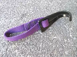 1. Shock absorbing sling designed to reduce peak loads in a climbing system. Very commonly used for winter / ice climbing. Made of a nylon webbing structure consisting of one large loop sewn in multiple places to make a shorter length.