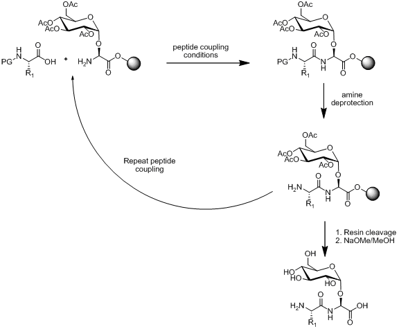 Within solid phase peptide synthesis (SPPS) there exist two strategies for the synthesis of glycopeptides, linear and convergent assembly. Linear assembly relies on the synthesis of building blocks and then the use of SPPS to attach the building block together. An outline of this approach is illustrated below.