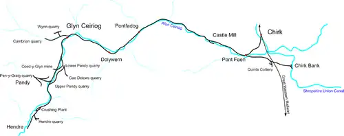 In 1885, additional parliamentary powers were obtained in the Glyn Valley Tramway Act 1885 (48 & 49 Vict. c. cxl) to abandon the Quinta Tramway section between Pontfaen and Chirk Bank, replacing it with a new line from Pontfaen to the Great Western Railway's Chirk station. Under the 1885 act access to canal wharfage was obtained by extending the tramway further North from Chirk Station to the redundant Black Park Collieries Dock Basin.[6] A two-mile extension was also authorized from Glyn to the quarries around Pandy. While the modified route was opened for mineral traffic promptly, there was a substantial delay in opening for passenger traffic arising from a dispute about the erection of a fence between the railway and the road on the new section into Chirk. The tramway eventually re-opened for passengers on Monday 16 March 1891.[7]