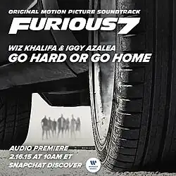 "Go Hard or Go Home" is a song by American rapper Wiz Khalifa and Australian rapper Iggy Azalea. It appears on the Furious 7: Original Motion Picture Soundtrack (2015) and was available as an instant track upon pre-ordering the album via iTunes stores on February 17, 2015.[1] The song was produced by The Featherstones. A second version entitled "Go Hard or Go Home Part 2" featuring Khalifa, French Montana, Trey Songz and Ty Dolla Sign was included as a bonus track on the deluxe version of the soundtrack.[2]