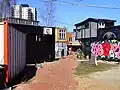 The decommissioned railway lines leading up to the former freight station, has been unused for many years, but along with the construction of the Godsbanen cultural centre, independent cultural actors were allowed by the municipality to move in. This led to the do-it-yourself village of Institut for (X), a recycling station, and other time limited cultural and social projects sprouting in the area since 2009. The deal is that while no rent is paid, settlements and activities should give way for future construction projects in the area. Along with the new Godsbanen cultural centre, this whole area was unofficially dubbed Aarhus K ("K" for Kultur or Culture in Danish) as a kind of new cultural district for the city.[9][10]