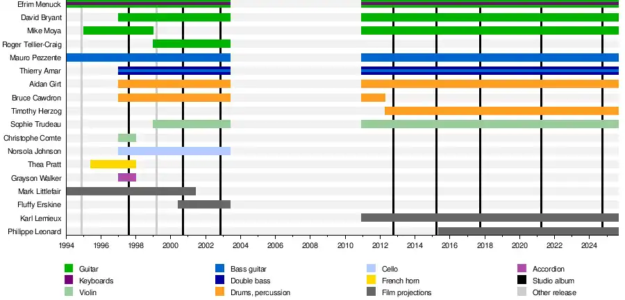 The band expanded and continued to perform live. According to Menuck, joining the group was simple: "It was like if anyone knew anybody who played an instrument and seemed like an okay person, they would sort of join up."[13] The group's number of members frequently changed during this time. Local musicians would often join the band for a handful of performances, then depart. The revolving door nature of the group's membership frequently caused it strain before the release of F♯ A♯ ∞.[13] After that release, the group stabilized around a nine-person lineup with Menuck, Moya and David Bryant on guitars, Pezzente and Thierry Amar on bass guitars, Aidan Girt and Bruce Cawdron on drums, and Sophie Trudeau and Norsola Johnson on violin and cello respectively. Moya would depart in 1998 to focus on HṚṢṬA, being replaced by Roger Tellier-Craig of Fly Pan Am.[14] Tellier-Craig left in 2004 to devote more time to Fly Pan Am.[15] In 2002, the band released their third album Yanqui U.X.O., which was recorded in Chicago and engineered by Steve Albini.[16]