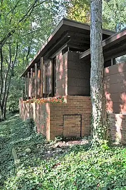The house is an "in-line Usonian", literally a house built in a straight line.[7] This layout is similar to "L"- or "T"-shaped Usonian designs like the Herbert and Katherine Jacobs First House, but they lack an additional wing.[12] The layout was necessitated by the fact that the house sits on a ridge.[13][14] The house is oriented roughly west-northwest to east-southeast, since the site slopes slightly upward to the northeast and more sharply downward to the southwest. The access driveway, made of red crushed stone, leads to a carport on the southeastern side of the house. Shrubbery and a parking area abut the building to the southwest, while a lawn with flowers on its perimeter abuts it to the northwest. The house is surrounded by trees except near its driveway. obscuring the views of neighboring low-rise houses.[2]