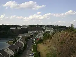 The northern part of Goffle Hill, except in a few locations, is buried under a mantle of glacially derived sediments and sandstone, greatly reducing its topographic prominence.[12] The southern part of the ridge displays a significant amount of trap rock, though some underlying red sandstone reaches up to the ridgeline halfway along the border of North Haledon and Hawthorne where quarrying has stripped away overlying trap rock. The majority of exposed trap rock occurs along high mural precipices facing to the east.