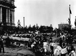 In 1880 the Chinese community leaders in Bendigo decided to place a levy on all Chinese in the region to buy items for use in the Easter Parade. Through this levy £750 was raised. It was sent to China and used to acquire a number of crates full of richly embroidered theatrical costumes. There were enough costumes to fit hundreds of players into a theatrical Chinese court, with scholars, generals, soldiers, princesses and an emperor. Some positions within the parade became highly sought after. The Chinese of the region would bid for the honour of wearing certain costumes. All the money would go to local charities. Much of this collection remains today.[12][13][14][15]