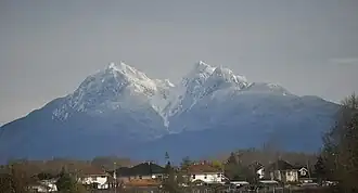 Golden Ears is the name of the double summit that lies north of Maple Ridge, British Columbia and is visible from most of the western Lower Mainland. The mountain is in Golden Ears Provincial Park, and was originally referred to as Golden Eyries,[1] possibly for golden eagles that were observed near the summit. There is confusion about the name, because of the twin summits the peak exhibits. Many people believe that the mountain is named because it looks like ears which become golden in the sunset light.