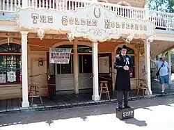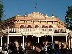 The Golden Horseshoe Saloon (referred to as Pecos Bill's Golden Horseshoe Saloon during construction) is a restaurant and attraction at Disneyland Park in Anaheim, California in the United States. It opened in 1955 with several other original attractions at Disneyland Park. Over the years the venue has housed multiple stage shows. The "saloon" is located in Frontierland and has views of the Rivers of America and New Orleans Square.