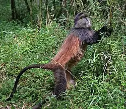 The golden monkey (Cercopithecus mitis kandti) is a subspecies of the blue monkey.[2] It is an Old World monkey found in the Virunga volcanic mountains of Central Africa, including four national parks: Mgahinga, in south-west Uganda; Volcanoes, in north-west Rwanda; and Virunga and Kahuzi-Biéga, in the eastern Democratic Republic of Congo. It is restricted to highland forest, especially near bamboo.