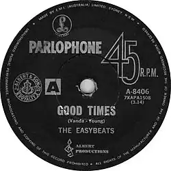 "Good Times" (aka "Gonna Have a Good Time") is a song by the Australian rock band the Easybeats, written by George Young and Harry Vanda. It was released in June 1968 on their album Vigil, and as a single in July 1968 through Parlophone. It features guest vocals by Steve Marriott of Small Faces, and piano by Nicky Hopkins. The original Easybeats recording reached #22 in Australia. When broadcast by BBC radio, it was reportedly heard by Paul McCartney on his car radio; McCartney apparently rang the station immediately to request a repeat playing.[1]