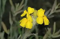 Goodenis glomerata is an erect herb that typically grows to a height of 50 cm (20 in) and has cottony yellowish to grey hairs. The leaves are mostly at the base of the plant, elliptic to lance-shaped with the narrower end towards the base, 6–200 mm (0.24–7.87 in) long and 10–22 mm (0.39–0.87 in) wide, with toothed edges. The flowers are arranged in compact spikes 120–300 mm (4.7–11.8 in) long with lance-shaped bracts 12–20 mm (0.47–0.79 in) long and bracteoles 8–15 mm (0.31–0.59 in) long. The sepals are linear to lance-shaped, 8–10 mm (0.31–0.39 in) long, the corolla yellow, 20–30 mm (0.79–1.18 in) long with cottony hairs and star-shaped hairs on the outside. The lower lobes of the corolla are 9–11 mm (0.35–0.43 in) long with wings about 2 mm (0.079 in) wide. The fruit is a cylindrical capsule 8–9 mm (0.31–0.35 in) long.[2][3]