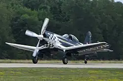 - 88458 (better known as "Race 57"): privately owned in Bentonville, Arkansas.[7] It was the fifth production aircraft and was purchased by Cook Cleland, who went on to finish first in the 1947 Thompson Trophy Race and first in the 1949 Tinnerman Trophy Race. Over time, the aircraft, registered as NX5588N, went from owner to owner and slowly deteriorated. Finally, in 1996, NX5588N was purchased by Bob Odegaard of North Dakota, and was returned to airworthy condition in 1999. The aircraft was on loan to the Fargo Air Museum.[8] Odegaard raced the aircraft in the Unlimited class at the Reno Air Races from 2006 to 2008 [9] and it was featured in the movie Thunder Over Reno.[10] The aircraft was bought in February, 2017 by Steuart Walton. It is based at Louise M. Thaden Airfield in Bentonville, Arkansas.